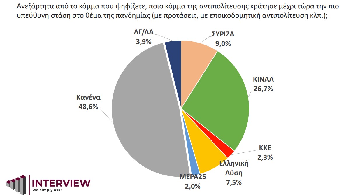 Στην ερώτηση: «Ανεξάρτητα από́ το κόμμα που ψηφίζετε, ποιο κόμμα της αντιπολίτευσης κράτησε μέχρι τώρα την πιο υπεύθυνη στάση στο θέμα της πανδημίας (με προτάσεις, με εποικοδομητική́ αντιπολίτευση κτλ.)», κερδισμένο είναι το «Κανένα» κόμμα με ποσοστό 48,6% και ακολουθεί το ΚΙΝΑΛ με 26,7%, ο ΣΥΡΙΖΑ με 9%, η Ελληνική Λύση με 7,5%, το ΚΚΕ με 2,3% και το ΜΕΡΑ25 με 2%.