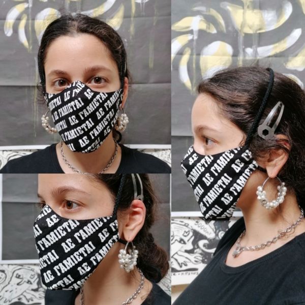 «Τα τυπογραφικά «Δε Γαμιέται» και «Δυστοπία» είναι του Βασίλη Γεωργίου με τον οποίο έχουμε μια μόνιμη συνεργασία και τα υπόλοιπα είναι δικά μου» συνεχίζει ο Μανώλης. «Τις μάσκες τις ράβει η κυρία Έφη Λαναρά, η μοδίστρα μας, σε ένα μικρό ραφείο στον Νέο Κόσμο. Η διαδικασία γενικά ξεκινάει από τόπι 100% βαμβακερό ύφασμα που έπειτα κόβεται σε πιο μικρά κομμάτια που τυπώνουμε με μεταξοτυπία μαζί με τον πατέρα μου τον Χρύσανθο χρησιμοποιώντας μελάνια που έχουν πιστοποίηση για βρεφικά ρούχα. Μετά κόβονται τα πατρόν ένα, ένα στο χέρι και στην συνέχεια ράβονται με διπλό ύφασμα στην μοδίστρα μας, στο τελικό κομμάτι τα πακετάρουμε με αγάπη και προσθέτουμε διάφορα εξτραδάκια μεταξοτυπίας στα πακέτα» λέει περιγράφοντας την διαδικασία που φτιάχνονται οι χειροποίητες μάσκες.
