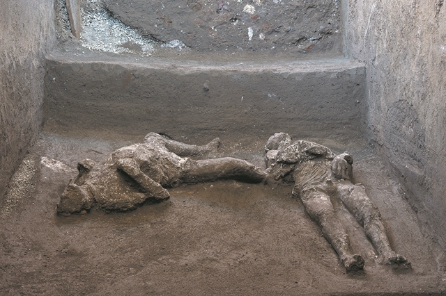 Οένας ήταν πλούσιος, καλοντυμένος, υγιής και ελεύθερος πολίτης. Ο άλλος φτωχικά ντυμένος, με μυοσκελετικά προβλήματα λόγω των βαρέων εργασιών που εκτελούσε, πιθανότατα δούλος. Και οι δύο όμως είχαν την ίδια τύχη όταν εξερράγη ο Βεζούβιος πριν από 1.941 χρόνια: πέθαναν ο ένας δίπλα στον άλλο στον διάδρομο μιας βίλας, στα περίχωρα της Πομπηίας, όπως αποκάλυψε πρόσφατα, η αρχαιολογική σκαπάνη. Ανακάλυψη που δεν θα είχε γίνει, ίσως, αν πριν από τρία χρόνια δεν συλλαμβάνονταν μια σπείρα αρχαιοκαπήλων που χρησιμοποιούσαν την έκταση όπου βρίσκονταν οι δύο νεκροί για να σκάβουν υπόγειες στοές για τις λαθρανασκαφικές τους δραστηριότητες.