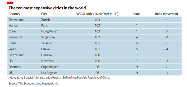 Οι τρεις πιο ακριβές πόλεις στον κόσμο είναι το Χονγκ Κονγκ, η Ζυρίχη (Ελβετία) και το Παρίσι (Γαλλία). Η Ζυρίχη και το Παρίσι έχουν ξεπεράσει τη Σιγκαπούρη και την Οζάκα (Ιαπωνία), οι οποίες έχουν υποχωρήσει στην κατάταξη.