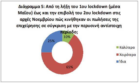 Η ενδιάμεση περίοδος μεταξύ των δυο lockdowns ήταν εξαιρετικά δύσκολη για τις επιχειρήσεις καθώς η πλειονότητα (65%) κατέγραψε χαμηλότερες πωλήσεις για το διάστημα μέσα Μαΐου – αρχές Νοεμβρίου 2020 σε σύγκριση με το αντίστοιχο διάστημα του 2019.