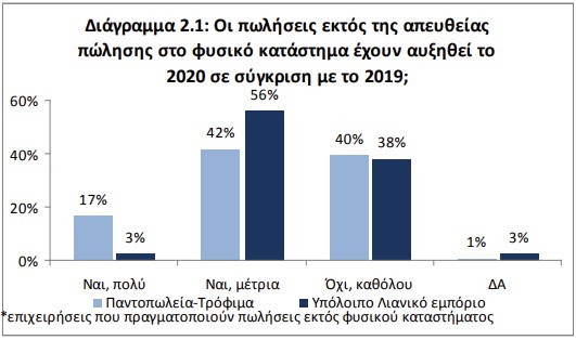 Σχεδόν έξι από τις δέκα (59%) επιχειρήσεις που έχουν τη δυνατότητα πώλησης εκτός φυσικού καταστήματος κατέγραψαν αύξηση των πωλήσεων τους σε σχέση με πέρυσι.