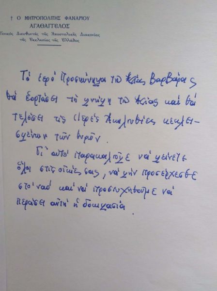 Από την πλευρά του ο κ. Μίχος παρέδωσε στον Υπουργό Προστασίας του Πολίτη μια χειρόγραφη επιστολή του Μητροπολίτη Φαναρίουκ.κ Αγαθάγγελου, στην οποία αναφέρεται πως οι Ιερές Ακολουθίες θα πραγματοποιηθούν κεκλεισμένων των θυρών και καλεί τους πιστούς να εορτάσουν στις οικίες τους και να μην προσέρχονται στον Ιερό Ναό.