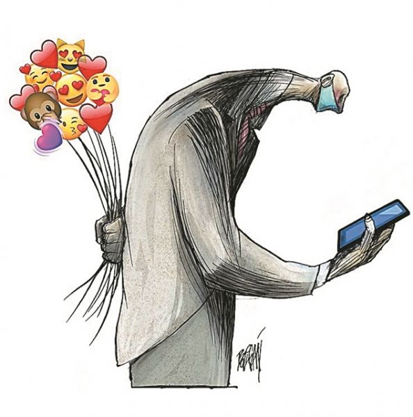 Τον έρωτα στα χρόνια του κορωνοϊού – που εκφράζεται μόνο ψηφιακά, με emojis – αποτυπώνει αριστoυργηματικά σε ένα από τα υπερρεαλιστικά σκίτσα του ο κουβανός καρτουνίστας Ανχελ Μπολιγάν, ενώ σε άλλα περιγράφει πώς φαίνονται από τη δική του οπτική γωνία συνθήκες που όλος ο κόσμος βιώνει, όπως είναι ο εγκλεισμός, η τηλεργασία, η μοναξιά, η φυσιολογική ανθρώπινη αγωνία για το επερχόμενο εμβόλιο, αλλά και η αγωνία μεγάλης μερίδας για το αποτέλεσμα των αμερικανικών εκλογών της 3ης Νοεμβρίου. Είναι κοινό μυστικό ότι οι απανταχού καρτουνίστες, από τη μέρα που εμφανίστηκε ο κορωνοϊός, δηλώνουν πιο παραγωγικοί από ποτέ. Για τους Αμερικανούς ειδικά όμως, η πηγή έμπνευσης πραγματικά δεν έχει ταβάνι, καθώς εκεί, η πρωτόγνωρη εμπειρία της πανδημίας συνδυάστηκε με την αμφιλεγόμενη διαχείριση της υγειονομικής κρίσης από τη διακυβέρνηση Τραμπ, κάνοντας κυριολεκτικά αμέτρητες τις γελοιογραφίες που παράγονται σε ημερήσια βάση με στόχο να φτιάξουν, ει δυνατόν, το κέφι του έθνους.