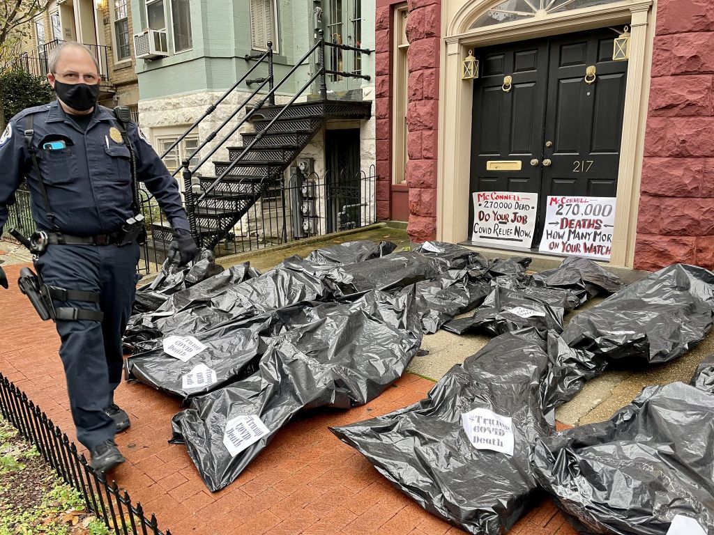 Σακούλες με «σορούς» άφησαν έξω από το σπίτι του ηγέτη των Ρεπουμπλικάνων στην αμερικανική Γερουσία, Μιτς ΜακΚόνελ, τον οποίο κατηγορούν πως «έχει βάψει τα χέρια του με αίμα» αφού καθυστερεί την έγκριση ενός πακέτου οικονομικής βοήθειας για τον νέο κοροναϊό».