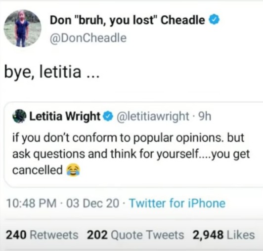 Αρκετοί διάσημοι επέκριναν επίσης την ηθοποιό, μεταξύ άλλων, ο συμπρωταγωνιστής της Ντον Τσιντλ, ο οποίος έγραψε και στη συνέχεια διέγραψε ένα tweet που ανέφερε: «αντίο, Λετίσια». Αργότερα ο ηθοποιός διευκρίνισε: «Δεν θα υπερασπιστώ ποτέ κανέναν που δημοσιεύει κάτι τέτοιο, αλλά δεν θα την απορρίψω».