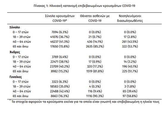 Η μέση ηλικία των κρουσμάτων είναι 44 έτη (εύρος 0 έως 104 ετών), ενώ η μέση ηλικία των θανάτων είναι 79 έτη (εύρος 25 έως 103 ετών). Η ηλικιακή κατανομή των (α) συνολικών κρουσμάτων, (β) των περιστατικών που κατέληξαν σε θάνατο και (γ) των ασθενών που νοσηλεύονται διασωληνωμένοι, είναι η ακόλουθη: