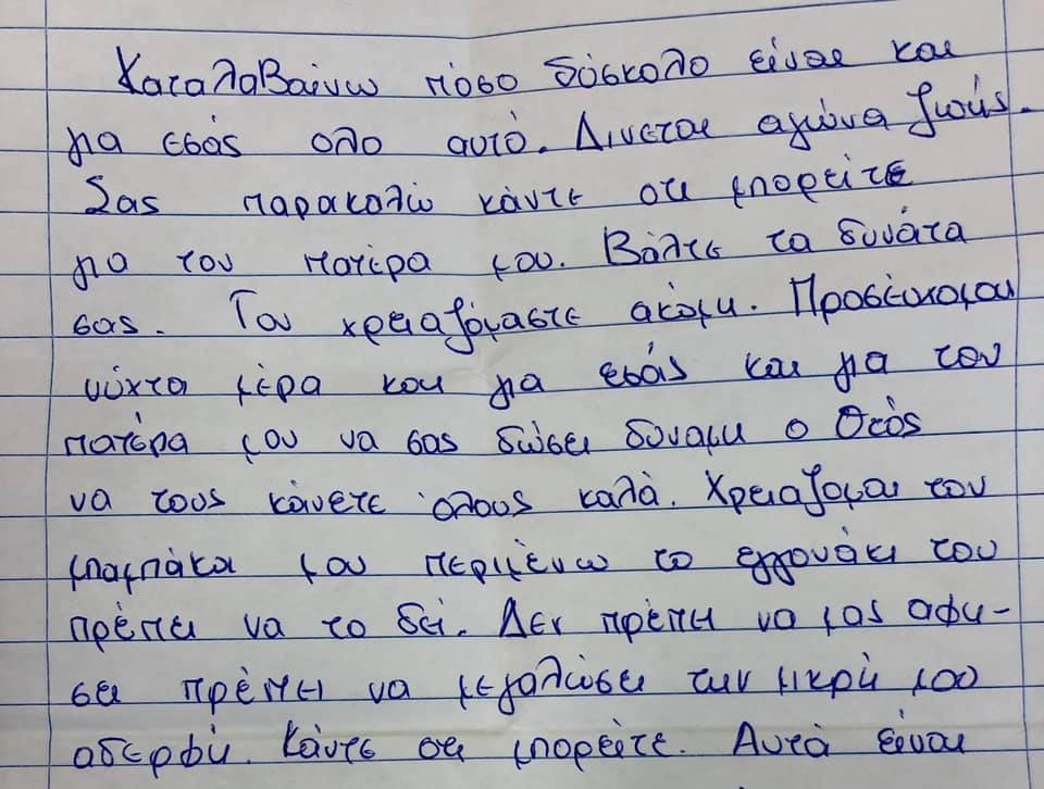 «Καταλαβαίνω πόσο δύσκολο είναι για εσάς όλο αυτό. Δίνετε αγώνα ζωής. Σας παρακαλώ κάντε ότι μπορείτε για τον πατέρα μου. Βάλτε τα δυνατά σας. Τον χρειαζόμαστε ακόμα. Προσεύχομαι νύχτα μέρα και για εσάς και για τον πατέρα μου, να σας δώσει δύναμη ο Θεός, να τους κάνετε όλους καλά».