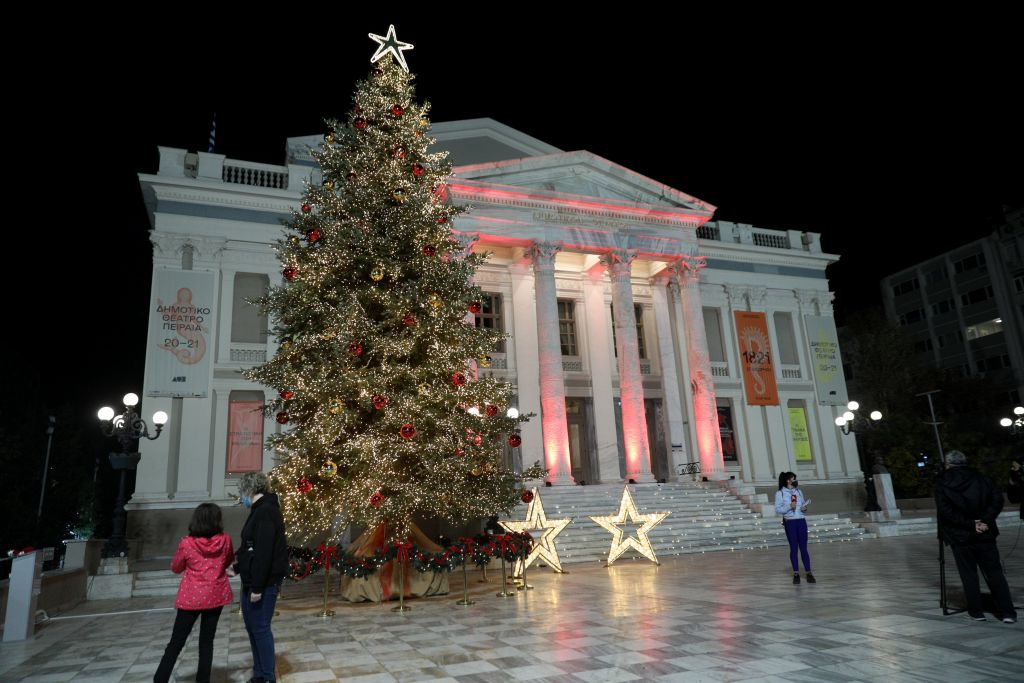 Με μια λιτή τελετή, έξω από το Δημοτικό Θέατρο Πειραιά, άναψε το χριστουγεννιάτικο δέντρο της πόλης, ύψους 15 μέτρων.