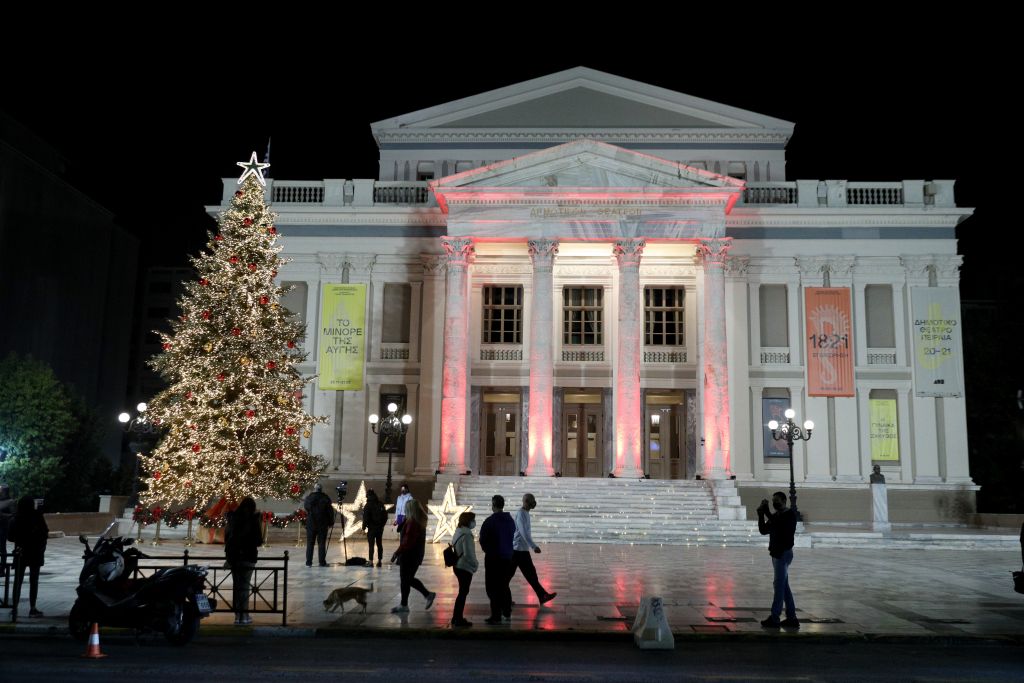 Με μια λιτή τελετή, έξω από το Δημοτικό Θέατρο Πειραιά, άναψε το χριστουγεννιάτικο δέντρο της πόλης, ύψους 15 μέτρων.