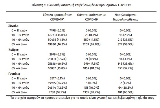 Η μέση ηλικία των κρουσμάτων είναι 44 έτη (εύρος 0 έως 104 ετών), ενώ η μέση ηλικία των θανάτων είναι 79 έτη (εύρος 25 έως 103 ετών). Η ηλικιακή κατανομή των (α) συνολικών κρουσμάτων, (β) των περιστατικών που κατέληξαν σε θάνατο και (γ) των ασθενών που νοσηλεύονται διασωληνωμένοι, είναι η ακόλουθη: