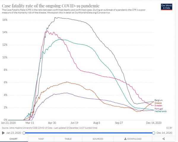 Σύμφωνα με το διάγραμμα ο δείκτης θνησιμότητας στη χώρα μας μέχρι τις 14 Δεκεμβρίου του 2020 ήταν στο 2,9%, ενώ στο Βέλγιο έχει φτάσει το 3%.