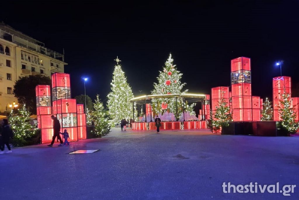 Στη γωνία της πλατείας Αριστοτέλους έχει τοποθετηθεί ένα δεύτερο δέντρο, ύψους 16 μέτρων, ενώ από τον χώρο δεν λείπει ούτε η φάτνη. Το σκηνικό συμπληρώνουν οι Κόκκινοι Πύργοι, οι περιμετρικές κατασκευές που αγοράστηκαν πέρσι και μεταποιήθηκαν για τις ανάγκες του φετινού διάκοσμου.