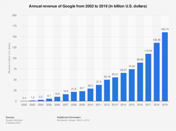 Τα έσοδα της Google (και της μητρικής της Alphabet) παρουσιάζουν εκθετική αύξηση την τελευταία 20ετία. Πέρυσι, για του λόγου το αληθές, σύμφωνα με τα επίσημα στοιχεία, διαμορφώθηκε λίγο πάνω από τα 160 δισ. δολάρια, έναντι 136 δισ. το 2018 και 110 δισ. το 2017.