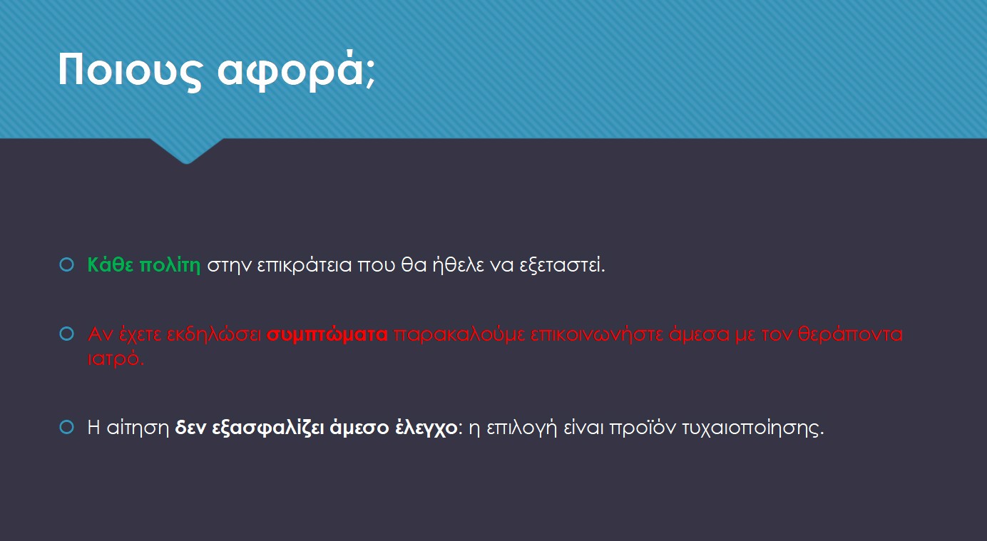 Αυτή αφορά όλους όσοι έχουν συμπτώματα κοροναϊού: Εκείνοι σε επικοινωνία με τον γιατρό τους θα πρέπει να προσέρχονται αυτοβούλως και αμέσως για τεστ, γιατί το σύστημα ίσως να μην τους επιλέξει για έλεγχο.