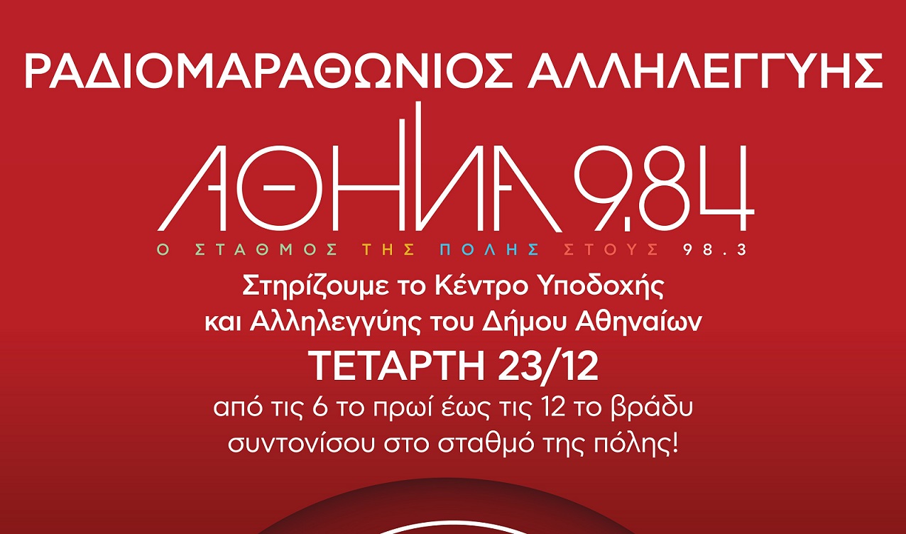 Ραδιομαραθώνιο Αλληλεγγύης διοργανώνει την Τετάρτη 23 Δεκεμβρίου ο «Αθήνα 9.84». Όλα τα έσοδα θα διατεθούν για την ενίσχυση του Κέντρου Υποδοχής και Αλληλεγγύης (ΚΥΑΔΑ) του Δήμου Αθηναίων.