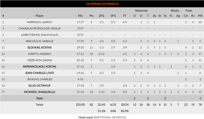 Μάρτιν και ΜακΚίσικ έκαναν μεγάλο ματς για τον Ολυμπιακό έχοντας από 18 πόντους έκαστος ενώ 11 είχε ο Σλούκας που ήταν ο μοιραίος στο φινάλε του ματς αλλά και της παράτασης με μία χαμένη βολή.