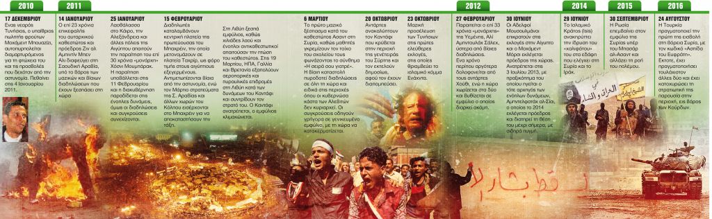 Με όλα όσα έχουν μεσολαβήσει στα δέκα αυτά χρόνια, οι λαοί μοιάζουν να έχουν και πάλι μπει στο περιθώριο, επιστρέφοντας στον γνωστό γι’ αυτούς ρόλο του κομπάρσου. Οι δε δυνάστες τους, στις διαμαρτυρίες που συνεχίζουν να ξεσπούν, απαντούν πότε με καταστολή και πότε με κυνισμό. Τον ίδιο κυνισμό που επέδειξαν το 2011 οι τότε κυβερνήσεις Βρετανίας, Γαλλίας και Ιταλίας, που ενώ αποθέωναν τον Καντάφι και έκλειναν μπίζνες μαζί του, μόλις είδαν την αλλαγή να έρχεται τον συνέτριψαν, ποντάροντας σε ακόμη καλύτερες θέσεις την επόμενη ημέρα. Τον ίδιο που επέδειξε και ο Ερντογάν, ο οποίος δεν δίστασε όλο αυτό τον καιρό να «παίξει» και με τον Isis και με τους Κούρδους, και με τις ΗΠΑ και με τη Ρωσία.