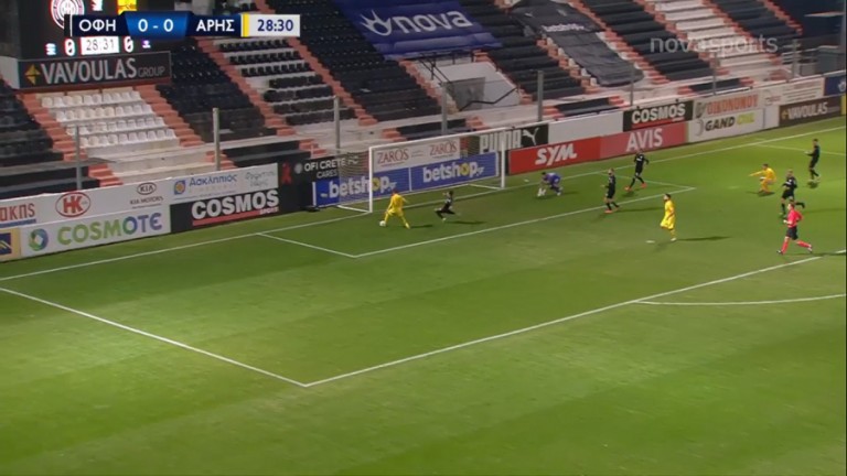 Στο 29′ ο Φακούντο Μπερτόλιο έκανε το 1-0 για τον Άρη απέναντι στον ΟΦΗ εκμεταλλευόμενος την απόκρουση του Σωτηρίου σε σουτ του Μάνου.
