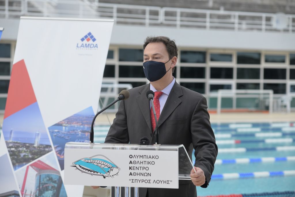 Τη «Σύμβαση Εργασιών Ανακαίνισης/Ανακατασκευής/Νέων Κατασκευών Εγκαταστάσεων του Ολυμπιακού Κέντρου Υγρού Στίβου» στο ΟΑΚΑ υπέγραψαν ο Υφυπουργός Πολιτισμού και Αθλητισμού Λευτέρης Αυγενάκης, ο Διευθύνων Σύμβουλος της LAMDA Development Οδυσσέας Αθανασίου, ο Διευθυντής Σχεδιασμού και Κατασκευής Έργου Ελληνικού της LAMDA Development Δημήτρης Ζωντανός και ο Πρόεδρος του ΔΣ του Ολυμπιακού Αθλητικού Κέντρου Αθήνας «Σπύρος Λούης» Νεκτάριος Βιδάκης.