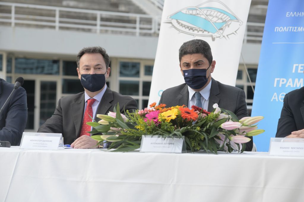 Ο Υφυπουργός Αθλητισμού Λευτέρης Αυγενάκης και ο Διευθύνων Σύμβουλος της LAMDA Development Οδυσσέας Αθανασίου υπέγραψαν τη «Σύμβαση Εργασιών Ανακαίνισης/Ανακατασκευής/Νέων Κατασκευών στις Εγκαταστάσεις του Ολυμπιακού Κέντρου Υγρού Στίβου».