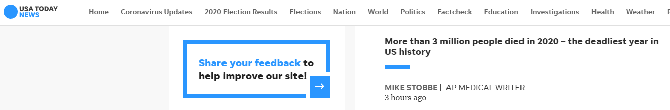 Σύμφωνα με τα προκαταρκτικά στοιχεία από το CDC, τα οποία δημοσιεύουν τα αμερικανικά ΜΜΕ, ανάμεσά τους το USA Today, οι ΗΠΑ αναμένεται να θρηνήσουν 3,2 εκατομμύρια νεκρούς το 2020, ποσοστό 15% πάνω από το 2019 που πέθαναν 2,8 εκατομμύρια άνθρωποι.