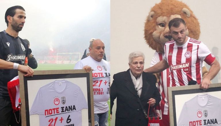 Πριν το ματς είχε προβληθεί ένα συγκινητικό βίντεο όπου μιλούν η μητέρα του αδικοχαμένου οπαδού του Ολυμπιακού Γιάννη Κανελλόπουλου (έχασε τη ζωή του στη τραγωδία της Θύρας 7 το 1981) και ο Ηλίας Βλαχόπουλος, ο οποίος βρισκόταν στο μοιραίο πούλμαν των Τεμπών το (1999).