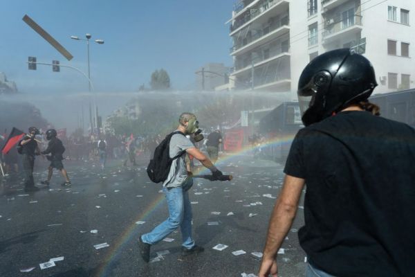 Ένα ουράνιο τόξο δημιουργείται στο οδόστρωμα της Λεωφόρου Αλεξάνδρας κατά τη ρίψη νερού από όχημα της αστυνομίας προς το συγκεντρωμένο πλήθος, δευτερόλεπτα μετά την ανακοίνωση της απόφασης του δικαστηρίου για την δίκη της εγκληματικής οργάνωσης Χρυσή Αυγή στις 7 Οκτωβρίου του 2020.