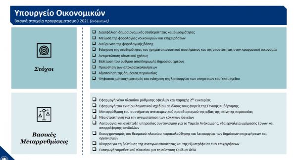 Σύμφωνα λοιπόν με «ενοποιημένο Σχέδιο Κυβερνητικής Πολιτικής 2021» που περιλαμβάνει αναλυτικά την κυβερνητική πορεία στη διάρκεια της νέας χρονιάς, αποκρυσταλλώνεται το ετήσιο πρόγραμμα, όπως η ψηφιακή μετάβαση, τα μεγάλα έργα υποδομών, η προώθηση της κυκλικής οικονομίας, της πράσινης ανάπτυξης, η διευκόλυνση των νέων επενδύσεων, η στήριξη των startups, ο εκσυγχρονισμός των μικρομεσαίων και η «γαλάζια οικονομία» στα νησιά. Θα κλιμακωθούν, επίσης, οι αποκρατικοποιήσεις, η απελευθέρωση της αγοράς στην ενέργεια και οι συμπράξεις δημόσιου και ιδιωτικού τομέα. Τα προσδοκώμενα αποτελέσματα του κυβερνητικού προγράμματος για το υπουργείο Οικονομικών εστιάζουν στην επίτευξη των μακροοικονομικών στόχων για αύξηση των ακαθάριστων επενδύσεων και του πραγματικού ΑΕΠ καθώς και των δημοσιονομικών στόχων που περιλαμβάνουν μείωση δημόσιου χρέους, αύξηση φορολογικών εσόδων και μείωση κενού ΦΠΑ καθώς και μείωση της ασφαλιστικής επιβάρυνσης στην εργασία.