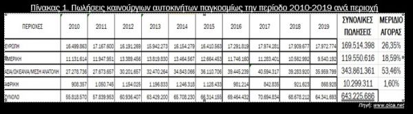 Πίνακας 1. Πωλήσεις καινούργιων αυτοκινήτων παγκοσμίως την περίοδο 2010-2019 ανά περιοχή – Πηγή: www.oica.net