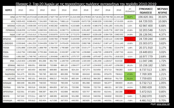 Πίνακας 2. Top-20 Χωρών με τις περισσότερες πωλήσεις αυτοκινήτων την περίοδο 2010-2019 – Πηγή: www.oica.net