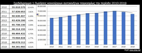 Σχεδιάγραμμα 1.Πωλήσεις καινούργιων αυτοκινήτων παγκοσμίως την περίοδο 2010-2019 – Πηγή: www.oica.net