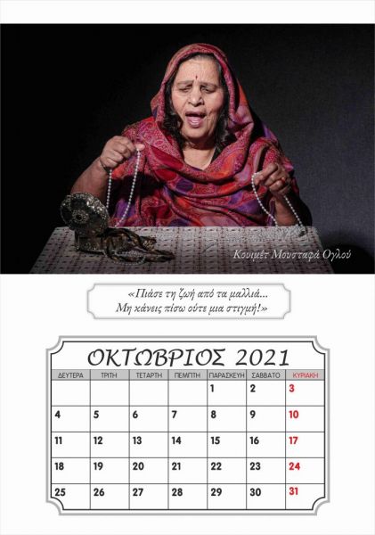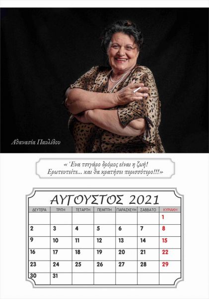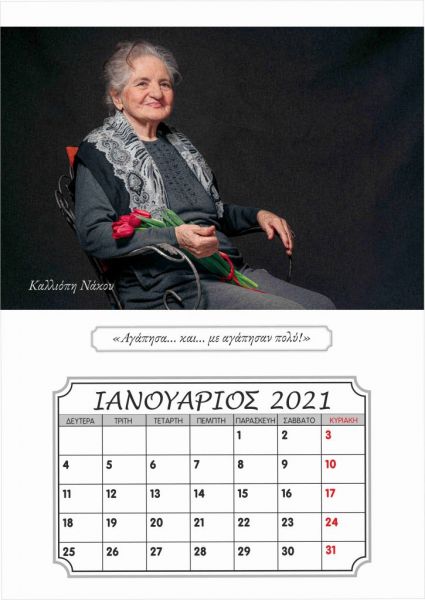 Μαζί με τους συνενοίκους της στο γηροκομείο, τον Λευτέρη Γιαγκίδη, που ποζάρει με το χαρακτηριστικό «καβουράκι» του και το κομπολόι στο χέρι στο εξώφυλλο του ημερολογίου, αλλά και τους Βασιλική Τσοκαλίδου, Κουιμέτ Μουσταφά Ογλού, Αθανασία και Θεόδωρο Παυλίδη, Χαράλαμπο Καραβασίλογλου, Αγαθή Ανδρεάδου, Γεωργία Χατζηαποστόλου και Ευαγγελία Καρακεσίσογλου, η Καλλιόπη Νάκου πόζαρε στον φακό της καλλιτεχνικής ομάδας φωτογραφίας του «ΕΡΓΑΣΤΗΡΙΟΥ ΦΩΤΟΓΡΑΦΙΑΣ», έτους 2019-2020, του Ιδρύματος Θρακικής Τέχνης και Παράδοσης (Ι.Θ.Π.Τ) Ξάνθης. Η καλλιτεχνική αυτή ομάδα μαζί με το γηροκομείο «Ο Μέγας Βασίλειος» και την εθελόντρια Σοφία Σαλβανά ένωσαν δυνάμεις και φαντασία και μεταμόρφωσαν τους ηλικιωμένους σε «πρωταγωνιστές σε πρώτο πλάνο».