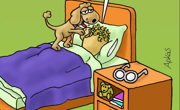 Ο ήρωας του σκιτσογράφου μετά από το… επίμονο πείραγμα του σκύλου του μάς λέει «καλημέρα»… αδυνατώντας ωστόσο να σηκωθεί από το κρεβάτι του, επηρεασμένος προφανώς από το σκηνικό του καιρού, καθώς και από το γεγονός ότι τα σχολεία παραμένουν ακόμη κλειστά.