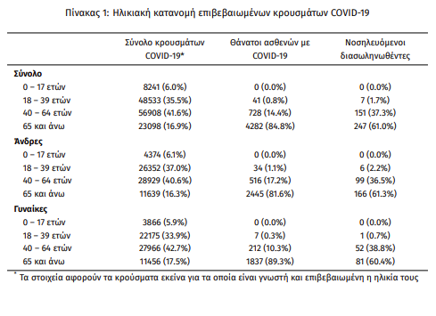 Η διάμεση ηλικία των κρουσμάτων είναι 44 έτη (εύρος 0.2 έως 104 ετών), ενώ η διάμεση ηλικία των θανάτων είναι 79 έτη (εύρος 24 έως 103 ετών). Η ηλικιακή κατανομή των (α) συνολικών κρουσμάτων, (β) των περιστατικών που κατέληξαν σε θάνατο και (γ) των ασθενών που νοσηλεύονται διασωληνωμένοι, είναι η ακόλουθη: