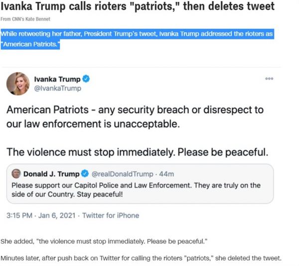 «Αμερικάνοι πατριώτες, οποιαδήποτε παραβίαση της ασφάλειας ή ανυπακοή στις δυνάμεις ασφαλείας είναι ανεπίτρεπτη. Η βία πρέπει να σταματήσει άμεσα», ήταν το tweet της με την αναφορά «Αμερικάνοι πατριώτες» να προκαλεί ουκ ολίγες αντιδράσεις. Λίγο μετά η Ιβάνκα Τραμπ εξαφάνισε το συγκεκριμένο μήνυμα.