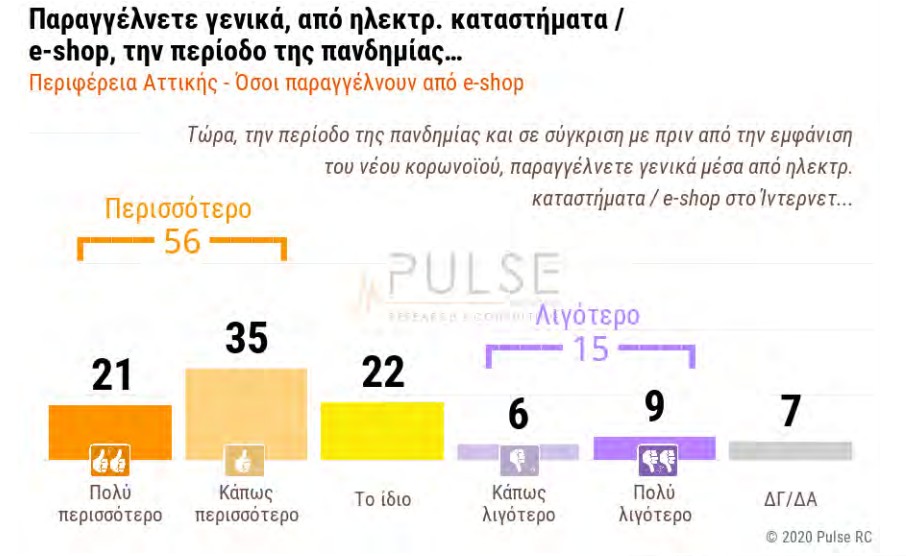 Μια από τις λίγες «καταναλωτικές συνήθειες» που καταγράφει σημαντική αύξηση είναι οι παραγγελίες και αγορές από ηλεκτρονικά καταστήματα, επιβεβαιώνοντας το αποτέλεσμα του αρχικού γενικού ερωτήματος! Το 56% (όλων όσοι παραγγέλνουν / αγοράζουν από e-shop), δήλωσαν ότι αύξησαν («κάπως» ή «πολύ») τις ηλεκτρονικές παραγγελίες τους.