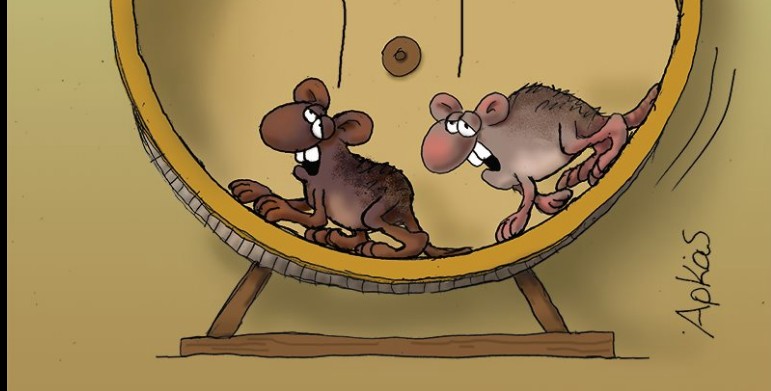 Ο καλλιτέχνης με το καυστικό χιούμορ στο σημερινό σκίτσο του βάζει δύο ποντίκια να τρέχουν πάνω σε μια ρόδα και να σχολιάζουν: