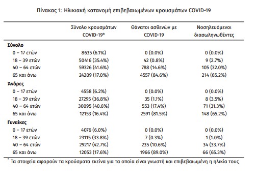 Τέλος, έχουμε 33 νέους θανάτους από τη νόσο COVID-19, φθάνοντας τους 5.387 θανάτους συνολικά στη χώρα, εκ των οποίων 3183 (59.1%) άνδρες. Η διάμεση ηλικία των θανόντων συμπολιτών μας ήταν τα 79 έτη και το 95.4% είχε κάποιο υποκείμενο νόσημα ή/και ηλικία 70 ετών και άνω.