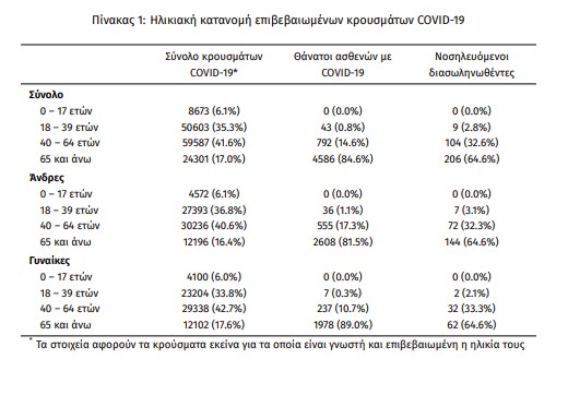 Η διάμεση ηλικία των κρουσμάτων είναι 44 έτη (εύρος 0.2 έως 104 ετών), ενώ η διάμεση ηλικία των θανάτων είναι 79 έτη (εύρος 24 έως 103 ετών). Η ηλικιακή κατανομή των (α) συνολικών κρουσμάτων, (β) των περιστατικών που κατέληξαν σε θάνατο και (γ) των ασθενών που νοσηλεύονται διασωληνωμένοι, είναι η ακόλουθη: