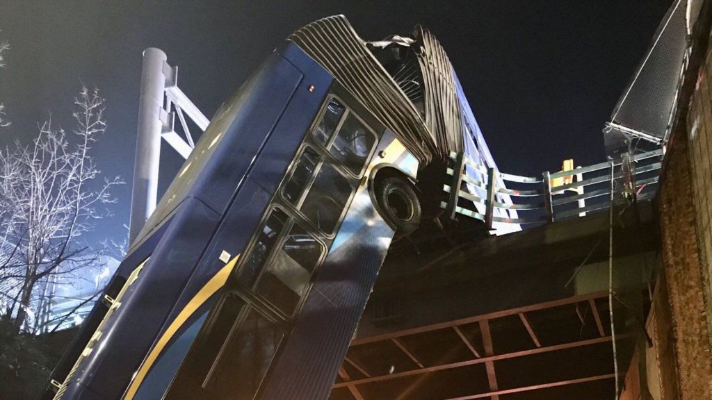 Ο οδηγός έχασε τον έλεγχο με αποτέλεσμα το λεωφορείο να κρέμεται από τη γέφυρα ταχείας κυκλοφορίας.