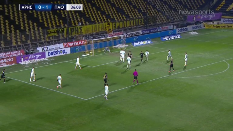 Στο 37′ ο Άρης άγγιξε το 1-1 αλλά η προβολή του Μαντσίνι από το γύρισμα του Γκαρσία σταμάτησε στο δοκάρι του Διούδη.