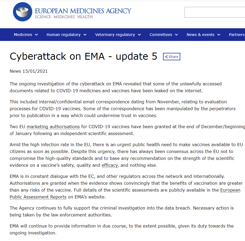 Στις 9 Δεκεμβρίου, ο EMA γνωστοποίησε ότι είχε υποστεί κυβερνοεπιθέσεις, μάλιστα την ίδια μέρα είχε γίνει γνωστό πως τα έγγραφα που είχαν παραβιαστεί αφορούσαν το εμβόλιο των Pfizer/ BioNTech. Την Παρασκευή, επιβεβαίωσε ότι ορισμένα από τα χακαρισμένα έγγραφα που αφορούσαν φάρμακα και εμβόλια κατά του κοροναϊού είχαν διαρρεύσει στο Διαδίκτυο, σημειώνοντας ότι «μέρος της αλληλογραφίας έχει χειραγωγηθεί από τους δράστες πριν από τη δημοσίευση με τρόπο που θα μπορούσε να υπονομεύσει την εμπιστοσύνη στα εμβόλια».