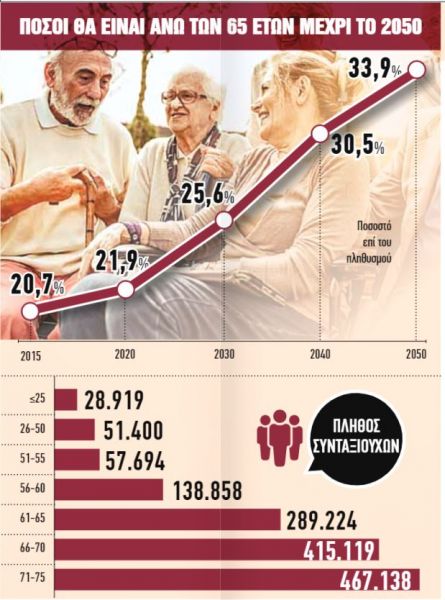 Γι’ αυτό και οι νέες αιτήσεις συνταξιοδότησης προβλέπεται ότι φέτος θα ξεπεράσουν τις 200.000! Ο «λογαριασμός» της γήρανσης του πληθυσµού για το ασφαλιστικό σύστηµα της Ελλάδας την περίοδο 2017-2065, σε συνάρτηση με την υπογεννητικότητα και την έκρηξη των ευέλικτων μορφών απασχόλησης, εκτιμάται στα 50 δισ. ευρώ, σύμφωνα με επιστημονική μελέτη του οµότιµου καθηγητή του Παντείου Πανεπιστηµίου Σάββα Ροµπόλη και του υποψήφιου διδάκτορα Βασίλη Μπέτση. Ολα αυτά δείχνουν ότι είναι πιθανή η αύξηση των γενικών ορίων ηλικίας συνταξιοδότησης στα 72 έτη έως το 2060, εφόσον τόσο στη χώρα μας όσο και στο σύνολο της Ευρωπαϊκής Ενωσης συνεχιστούν οι ασκούμενες πολιτικές που, με στόχο την επίλυση του δημογραφικού προβλήματος και της γήρανσης του πληθυσμού, καταλήγουν στην εύκολη λύση της παράτασης του εργασιακού βίου.