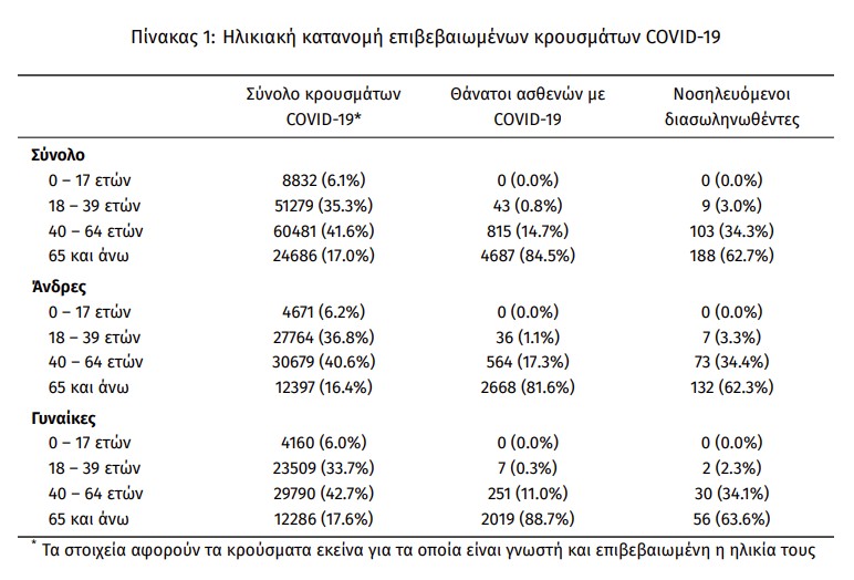 Τέλος, έχουμε 27 νέους θανάτους από τη νόσο COVID-19, φθάνοντας τους 5545 θανάτους συνολικά στη χώρα, εκ των οποίων 3271 (59.0%) άνδρες. Η διάμεση ηλικία των θανόντων συμπολιτών μας ήταν τα 79 έτη και το 95.4% είχε κάποιο υποκείμενο νόσημα ή/και ηλικία 70 ετών και άνω.