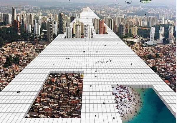 Τρεις χιλιάδες μίλια μακριά, σε μια γκαλερί των Βρυξελλών, εκτίθεται ένα φωτομοντάζ από τη δεκαετία του 1960 που παρουσιάζει ένα ανατριχιαστικά παρεμφερές όραμα, ως μέρος μιας νέας έκθεσης για τη ριζοσπαστική κολλεκτίβα ιταλών αρχιτεκτόνων, το Superstudio. Μια τεράστια λευκή λωρίδα απεικονίζεται να κόβει στα δύο την έρημο, να περνά από αμμόλοφους και να προσπερνά φοίνικες δημιουργώντας έναν συμπαγή αστικό ιστό.