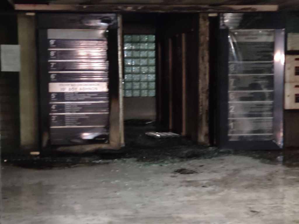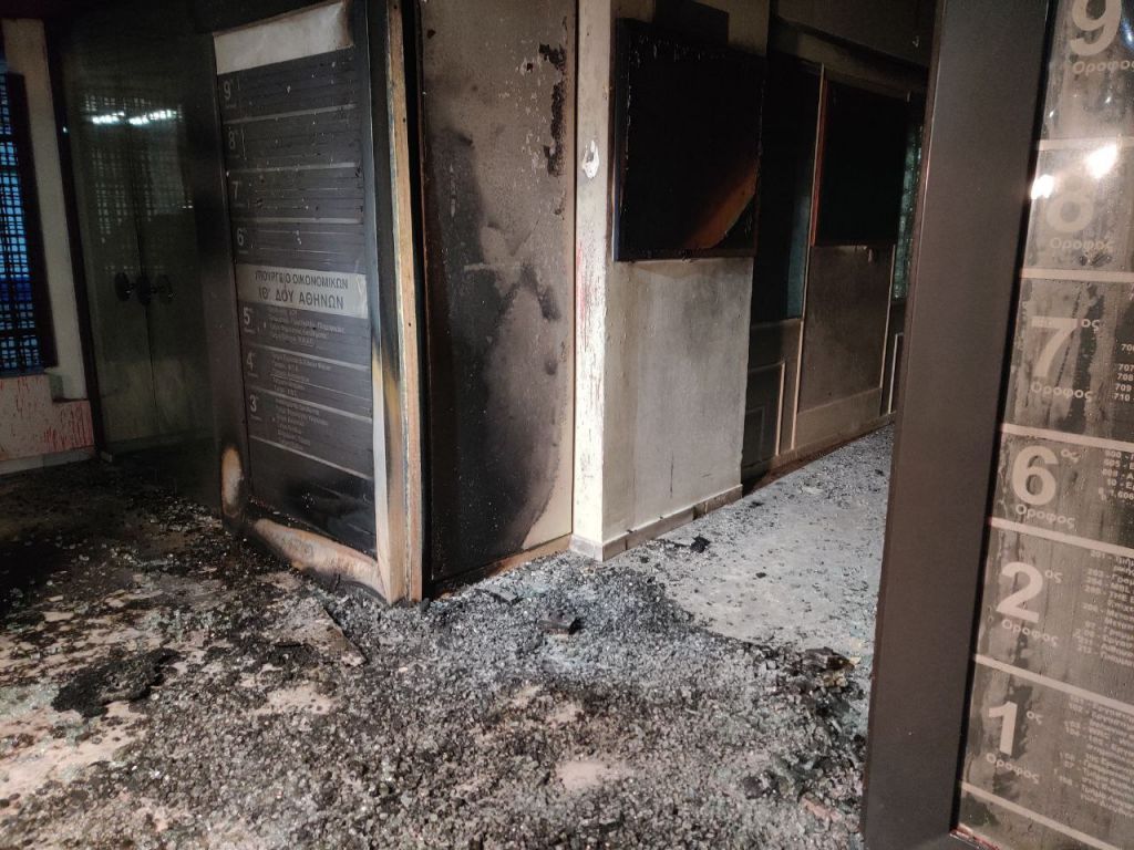 Από την εμπρηστική επίθεση σημειώθηκαν ζημιές στην είσοδο του κτηρίου, επί των οδών Λευκάδος και Ευελπίδων.