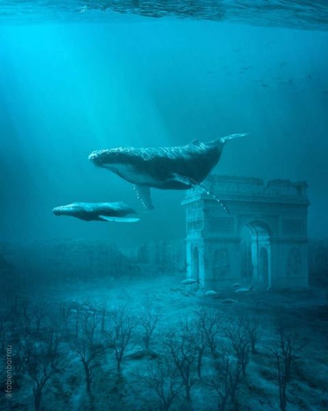 Η εικόνα με τις δύο φάλαινες που κολυμπούν πάνω από την Αψίδα του Θριάμβου στο βυθισμένο Παρίσι είναι εμπνευσμένη από το έργο του Γάλλου καλλιτέχνη Roland Cat, που στη δεκαετία του ‘70 και του ‘80 ζωγράφιζε θαλάσσια πλάσματα να κολυμπούν πάνω από κατεστραμμένες πόλεις.