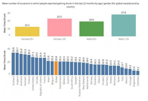 Με αυτόν τον ορισμό, Σκωτσέζοι και Άγγλοι δήλωσαν ότι είχαν μεθύσει κατά μέσο όρο περισσότερες από 33 φορές τον τελευταίο χρόνο. Αυτό ήταν το υψηλότερο ποσοστό και των 25 χωρών που μελετήθηκαν και περισσότερο από το διπλάσιο του ποσοστού αρκετών ευρωπαϊκών χωρών, όπως η Πολωνία, η Ουγγαρία, η Γερμανία, η Ελλάδα, η Ισπανία, η Ιταλία και η Πορτογαλία. Ο παγκόσμιος μέσος όρος ήταν πάνω από 20 φορές, με τους Κολομβιανούς να αναφέρουν το χαμηλότερο: 6,5 φορές.
