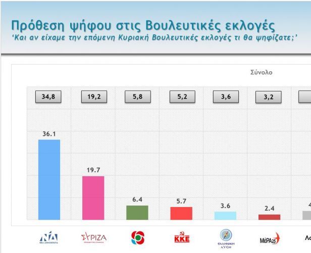Στην πρόθεση ψήφου, η διαφορά μεταξύ ΝΔ και ΣΥΡΙΖΑ παραμένει σε υψηλά επίπεδα. Συγκεκριμένα, το κυβερνών κόμμα λαμβάνει ποσοστό 36,1%, αυξημένο κατά 1,3 μονάδες σε σχέση με τον Δεκέμβριο (34,8%). Ο ΣΥΡΙΖΑ κερδίζει μισή μονάδα και φτάνει στο 19,7%, επομένως η διαφορά τον Ιανουάριο φτάνει τις 16,4 μονάδες (από 15,6% τον Δεκέμβριο).